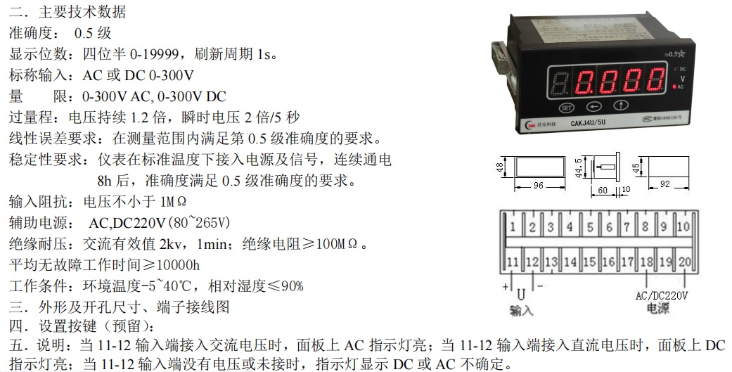 CAKJ494U/5U交直流電壓表適用于交直流系統(tǒng)電壓測(cè)量顯示。儀表采用高速AD轉(zhuǎn)換器及微處理器,對(duì)測(cè)量交直流電壓高速采樣,自動(dòng)識(shí)別測(cè)量電壓為交流或直流,并帶有相應(yīng)LED指示。