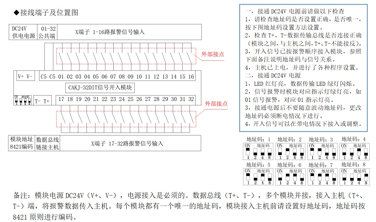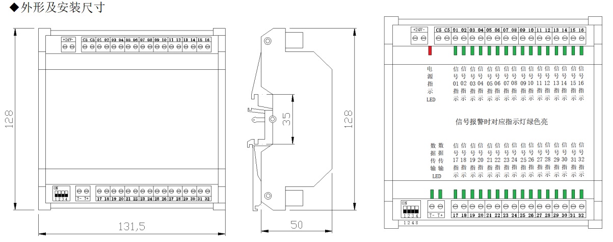 CAKJ-32DIT干接點信號采集模塊,接點信號開入,485通訊輸出。接點接通指示燈亮。