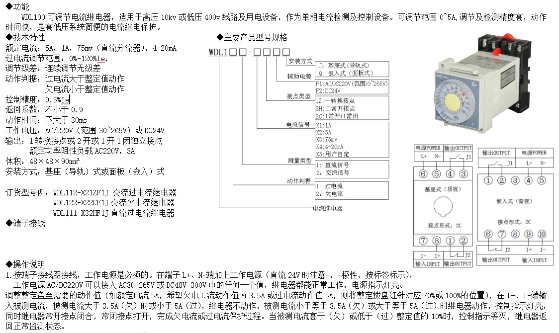 WDL100可調(diào)節(jié)電流繼電器,適用于高壓10kv或低壓400v線路及用電設(shè)備,作為單相電流檢測及控制設(shè)備??烧{(diào)節(jié)范圍0~5A,調(diào)節(jié)及檢測精度高,動作時間快,是高低壓系統(tǒng)簡便可靠的電流繼電保護。